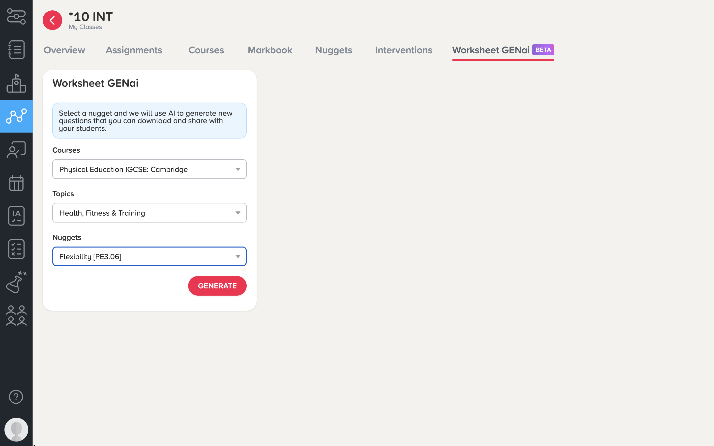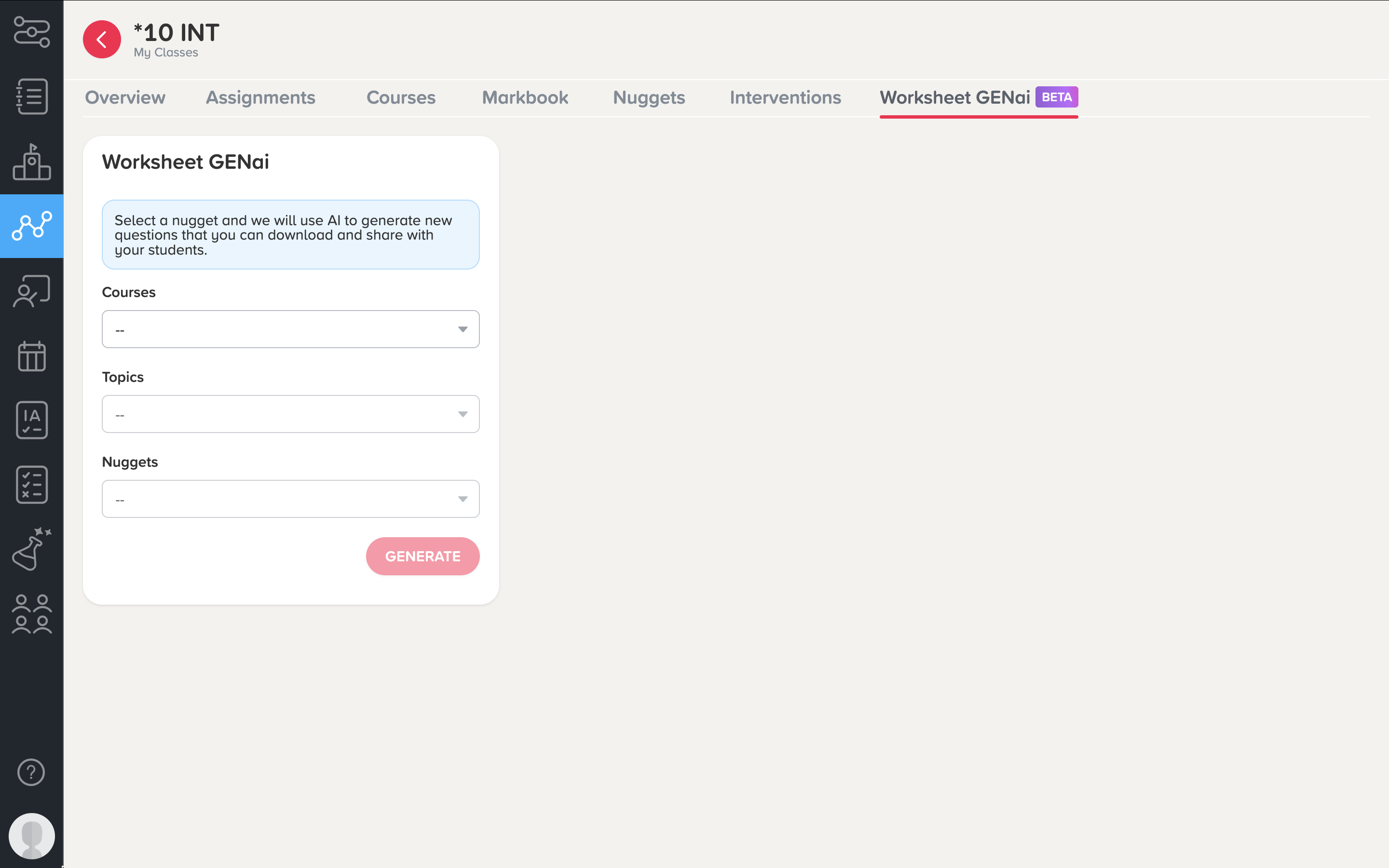 Note: Only classes with eligible courses will have the Worksheet GENai tab appear. To learn more about which courses are available for worksheet generation, click here.