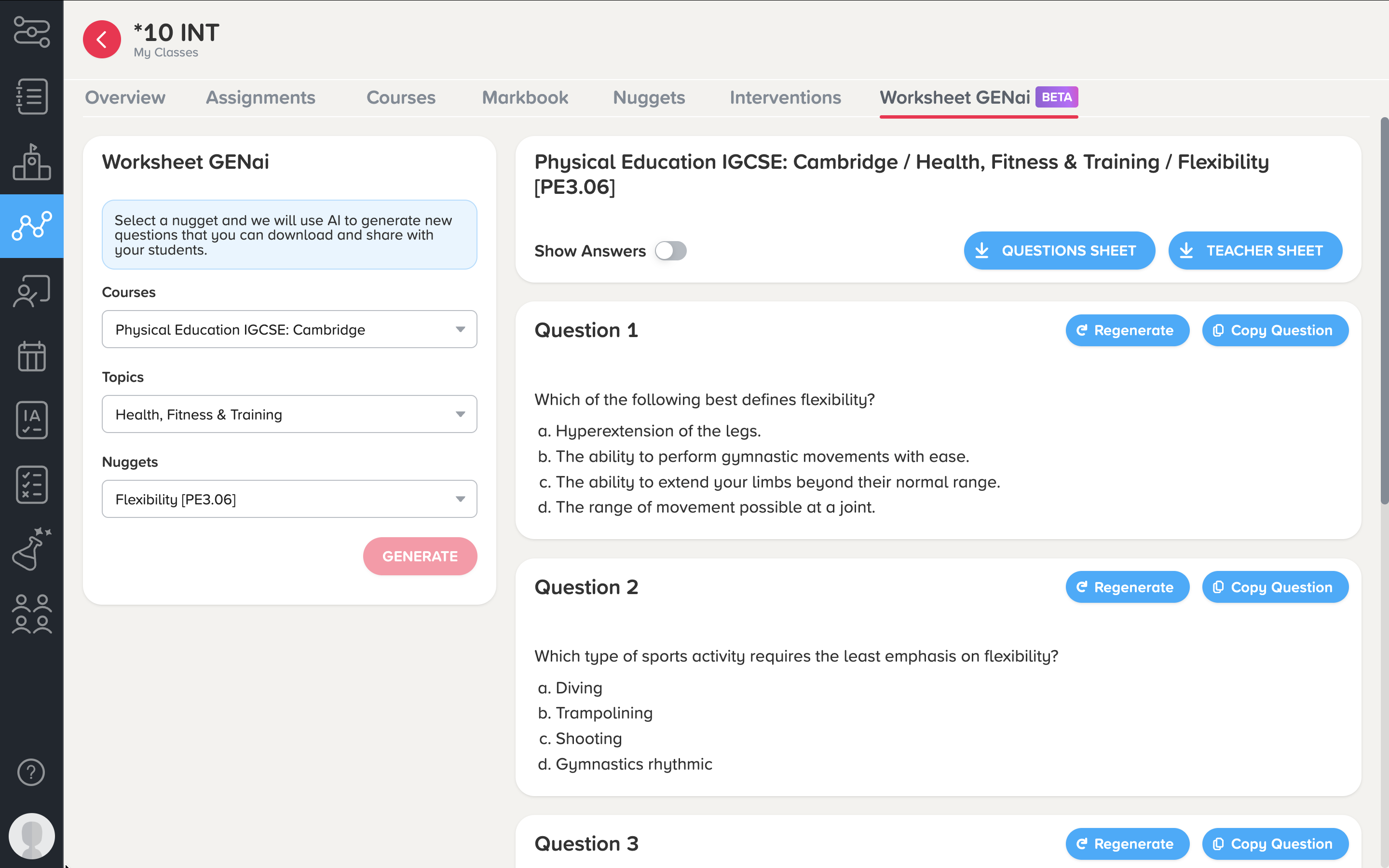 3. Click ‘Generate’ and a worksheet will be created! You can regenerate new questions at any time, which will prompt you to supply feedback to the team.