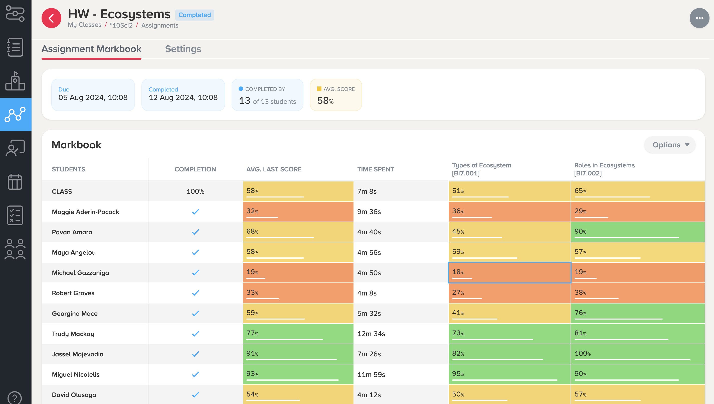 Click into an assignment to be taken to the Assignment Markbook, where you can view average scores for each student, their time spent on the assignment, and a more detailed question-level analysis of how they answered in each nugget.